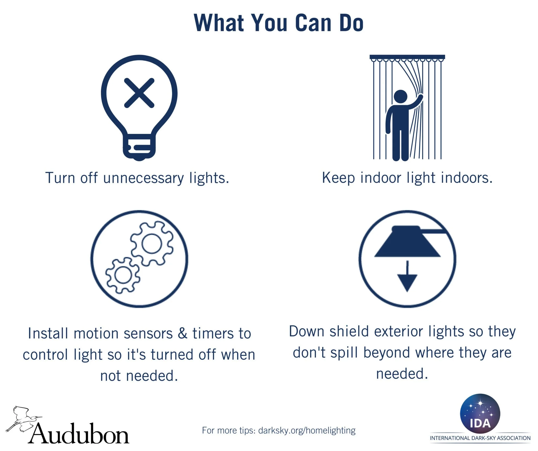 As a Connecticut resident, business, property owner, school, or church, I pledge to minimize all non-essential lights from 11pm to 6am and make seasonal lighting changes during peak spring and fall bird migration: April 1 - May 31 and August 15 - November 15. Specific actions I will take include: